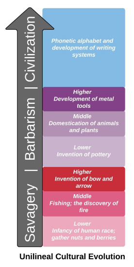 However, the present inhabitants of Egypt in Lovecraft’s writing and in real life at the time, like Abdul in Under the Pyramids, were given stereotypes that would stick over time. In archaeological terms, indigenous populations of places like Egypt were seen as separate from their ancient kin who built the pyramids. This is due to the model of Darwinian archaeology where societies could only advance from Savagery to Civilization, and it is not seen as possible to “regress” (See the Unilineal Cultural Evolution chart below).